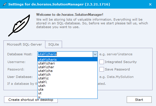 • username (Benutzername für SQL-Authentifizierung; bleibt leer bei integrierter Authentifizierung)