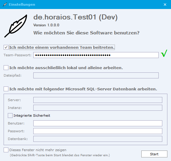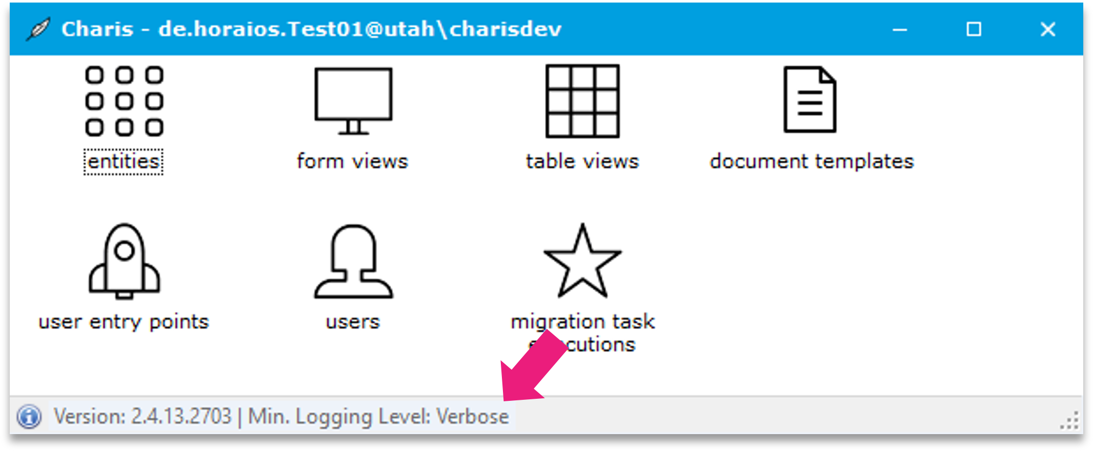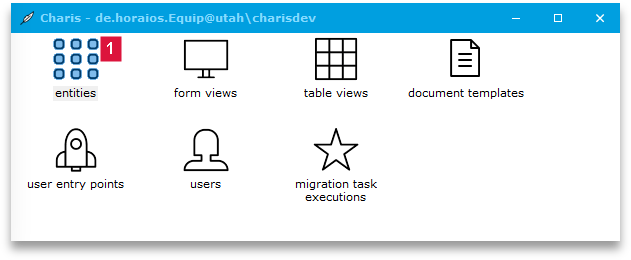 • Das Startfenster einer Charis-Anwendung merkt sich den zuletzt Verwendenten Verwendungszweck (beispielsweise "Dev", "Test" oder "Prod").
