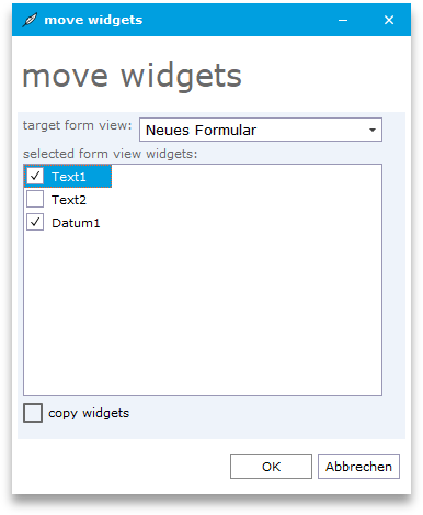 • Eine beliebige Gruppe von Widgets eines Formulares kann in ein anderes Formular verschoben bzw. kopiert werden.