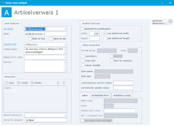 • Ein generiertes Behavior zum Öffnen eines Tabelleneintrags erhält die abweichende Bezeichnung (preferred caption) "Öffnen" (nicht "Bearbeiten").
